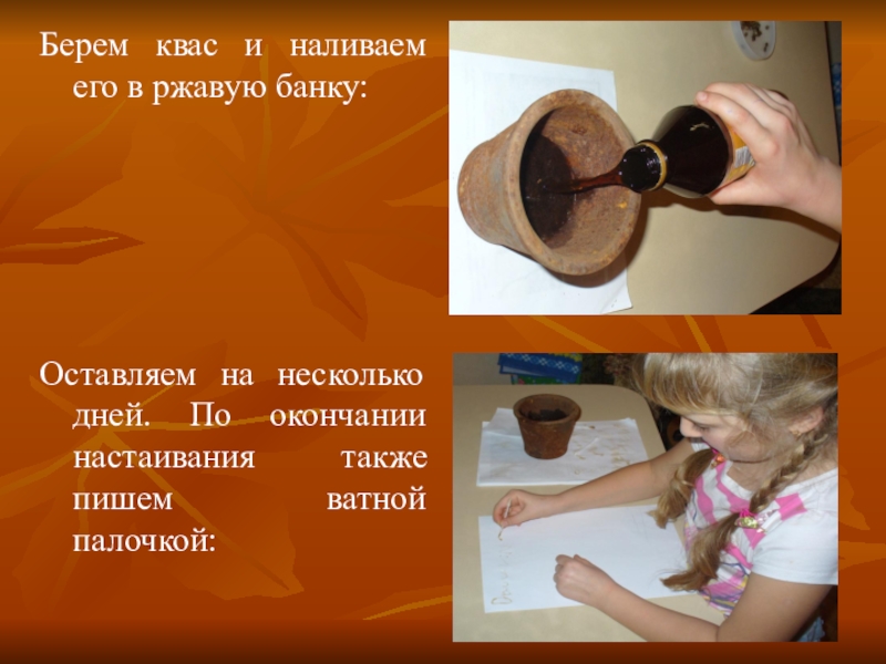 Слайд 14Берем квас и наливаем его в ржавую банку: