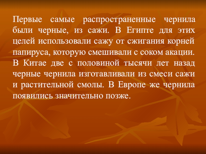 Слайд 8Первые самые распространенные чернила были черные, из сажи. В Египте для
