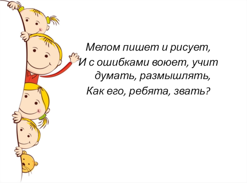 Мелом пишет и рисует,И с ошибками воюет, учит думать, размышлять,Как его, ребята, звать?