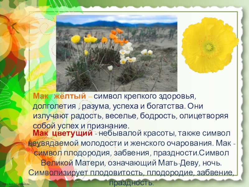 Слайд 6Мак жёлтый – символ крепкого здоровья, долголетия , разума, успеха