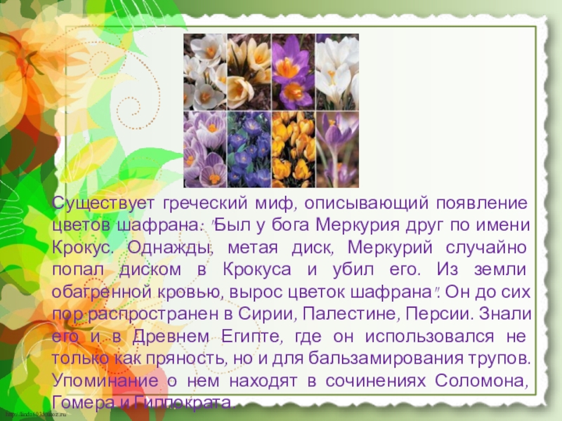 Слайд 9Существует греческий миф, описывающий появление цветов шафрана: "Был у бога Меркурия