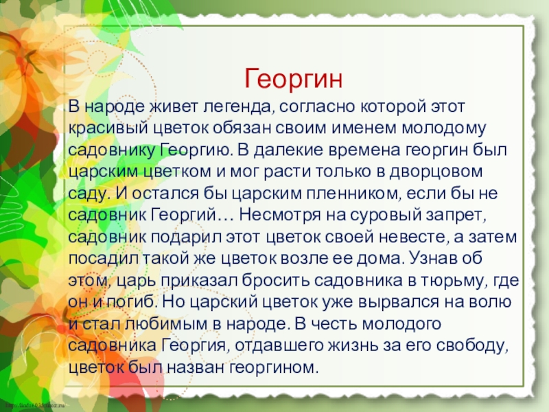 именем молодому садовнику Георгию. В далекие времена георгин был царским цветком и мог расти только в дворцовом саду. И остался бы царским пленником, если бы не садовник Георгий… Несмотря на суровый запрет, садовник подарил этот цветок своей невесте, а затем посадил такой же цветок возле ее дома. Узнав об этом, царь приказал бросить садовника в тюрьму, где он и погиб. Но царский цветок уже вырвался на волю и стал любимым в народе. В честь молодого садовника Георгия, отдавшего жизнь за его свободу, цветок был назван георгином.