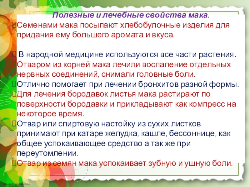 Отвар из семян мака успокаивает зубную и ушную боли.