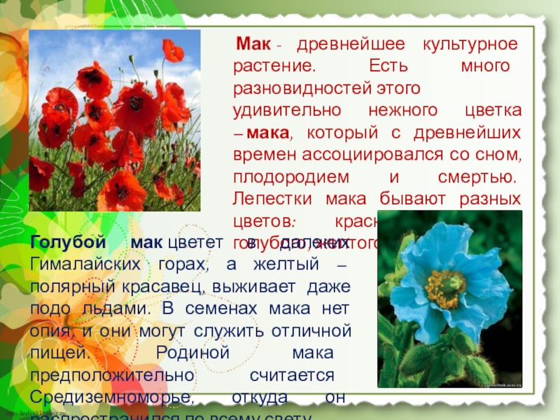 Голубой мак цветет в далеких Гималайских горах, а желтый – полярный красавец, выживает даже подо льдами. В семенах мака нет опия, и они могут служить отличной пищей. Родиной мака предположительно считается Средиземноморье, откуда он распространился по всему свету.