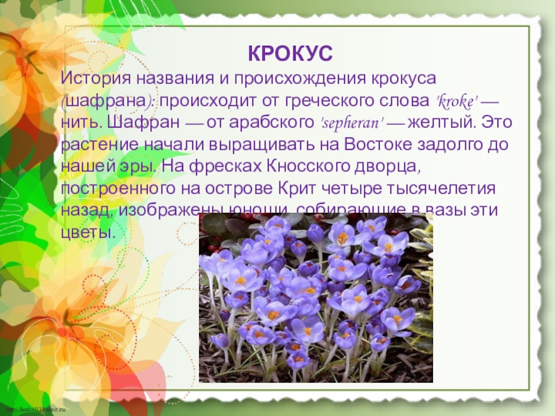 История названия и происхождения крокуса (шафрана): происходит от греческого слова 'kroke'