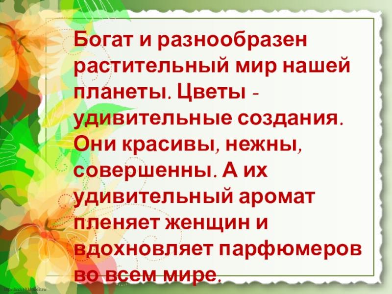 Слайд 3Богат и разнообразен растительный мир нашей планеты. Цветы -удивительные создания. Они