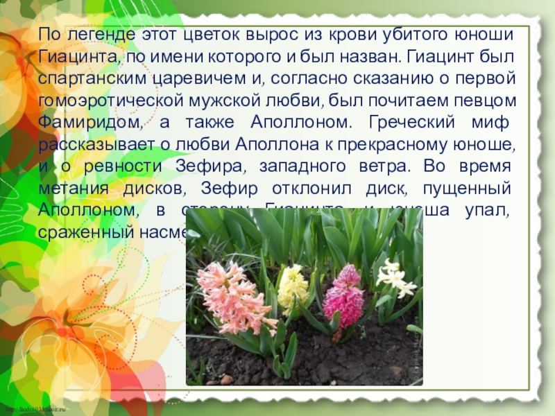 Слайд 13По легенде этот цветок вырос из крови убитого юноши Гиацинта, по
