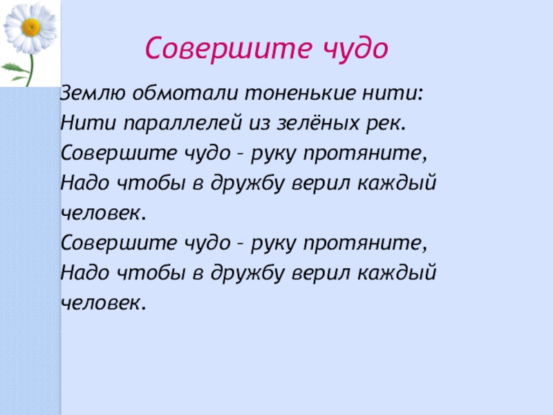 Землю обмотали тоненькие нити: Нити параллелей из зелёных рек. Совершите чудо – руку протяните, Надо чтобы в дружбу верил каждый человек. Совершите чудо – руку протяните, Надо чтобы в дружбу верил каждый человек. .