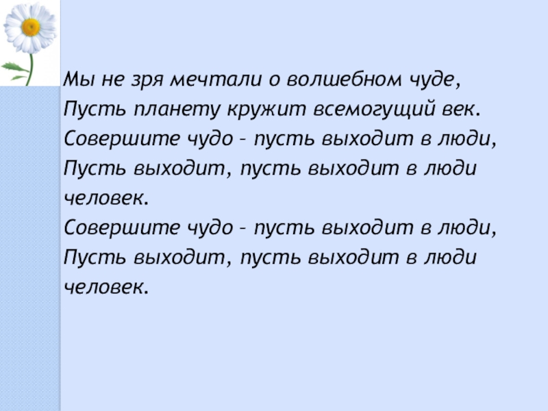 Мы не зря мечтали о волшебном чуде, Пусть планету кружит всемогущий век. Совершите чудо – пусть выходит