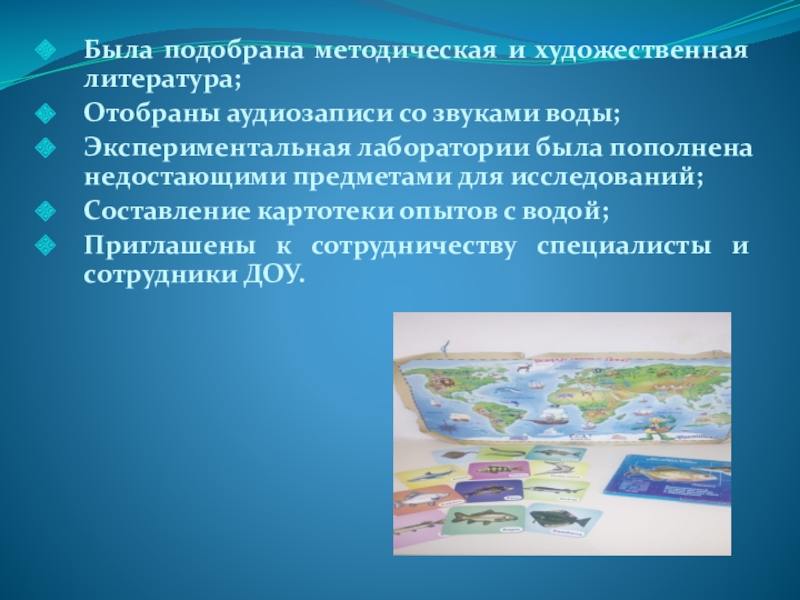 Была подобрана методическая и художественная литература;Отобраны аудиозаписи со звуками воды;Экспериментальная лаборатории была пополнена недостающими предметами для исследований;Составление