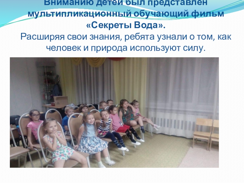 Слайд 6Вниманию детей был представлен мультипликационный обучающий фильм «Секреты Вода». Расширяя свои знания,