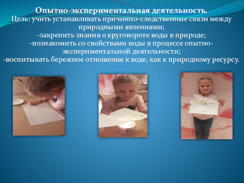 Слайд 7Опытно-экспериментальная деятельность. Цель: учить устанавливать причинно-следственные связи между природными явлениями; -закрепить знания
