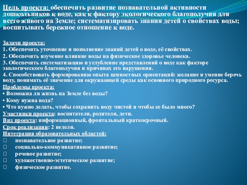 Цель проекта: обеспечить развитие познавательной активности дошкольников к воде, как к фактору экологического благополучия для всего живого на Земле; систематизировать знания детей о свойствах воды; воспитывать бережное отношение к воде.Задачи проекта: 1. Обеспечить уточнение и пополнение