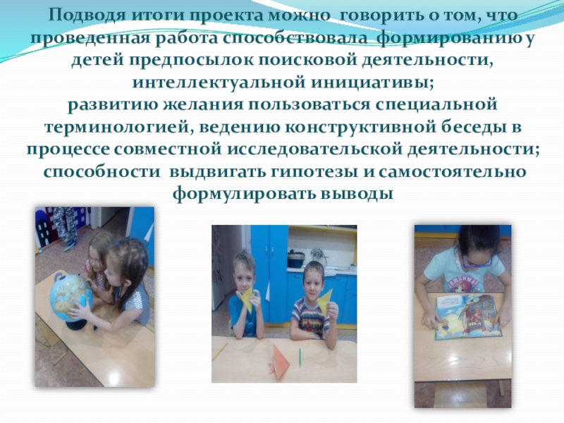 Подводя итоги проекта можно говорить о том, что проведенная работа способствовала формированию у детей предпосылок поисковой деятельности,
