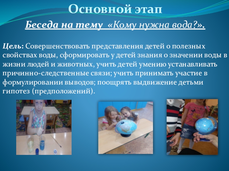 Основной этапБеседа на тему «Кому нужна вода?». Цель: Совершенствовать представления детей о полезных свойствах воды, сформировать у