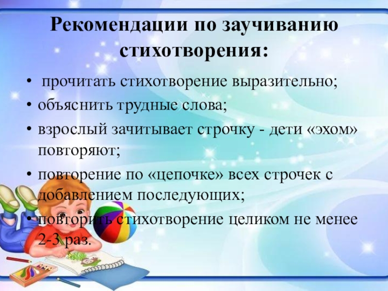 Слайд 8Рекомендации по заучиванию стихотворения: