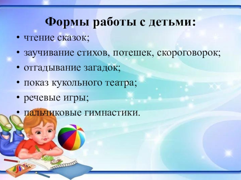 Формы работы с детьми: чтение сказок;заучивание стихов, потешек, скороговорок;отгадывание загадок;показ кукольного театра;речевые игры;пальчиковые гимнастики.
