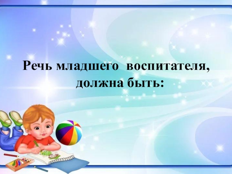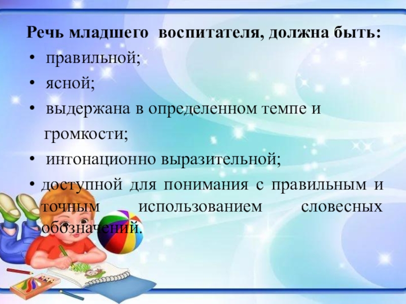 Речь младшего воспитателя, должна быть: правильной; ясной; выдержана в определенном темпе и   громкости; интонационно выразительной;