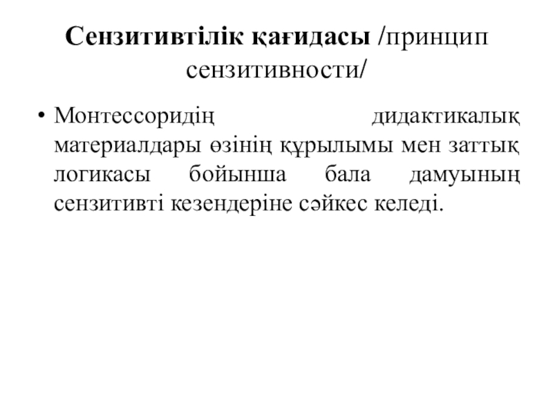Сензитивтілік қағидасы /принцип сензитивности/  Монтессоридің дидактикалық материалдары өзінің құрылымы мен заттық логикасы бойынша бала дамуының сензитивті