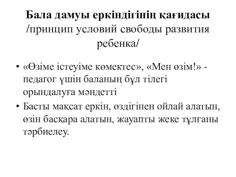 Слайд 3Бала дамуы еркіндігінің қағидасы /принцип условий свободы развития ребенка/