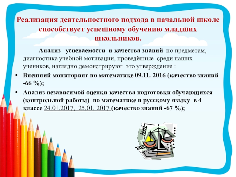 Слайд 13Реализация деятельностного подхода в начальной школе способствует успешному обучению младших школьников.