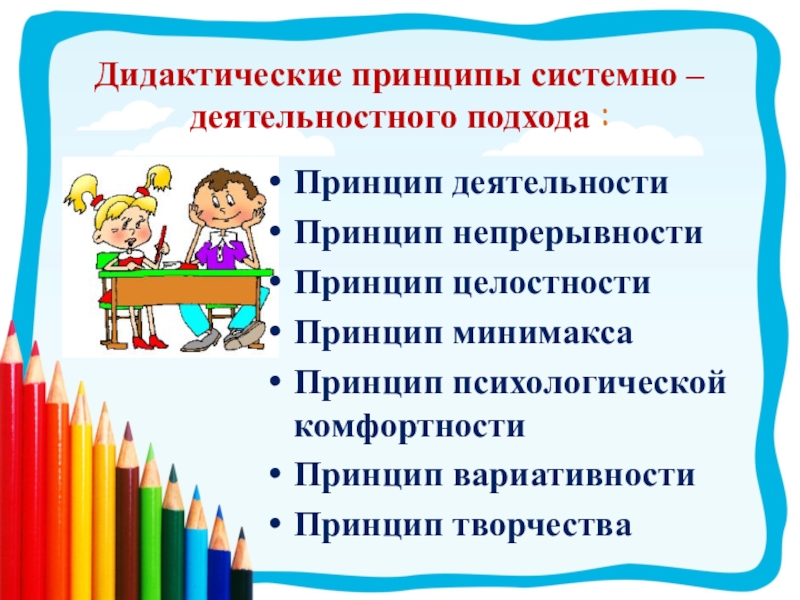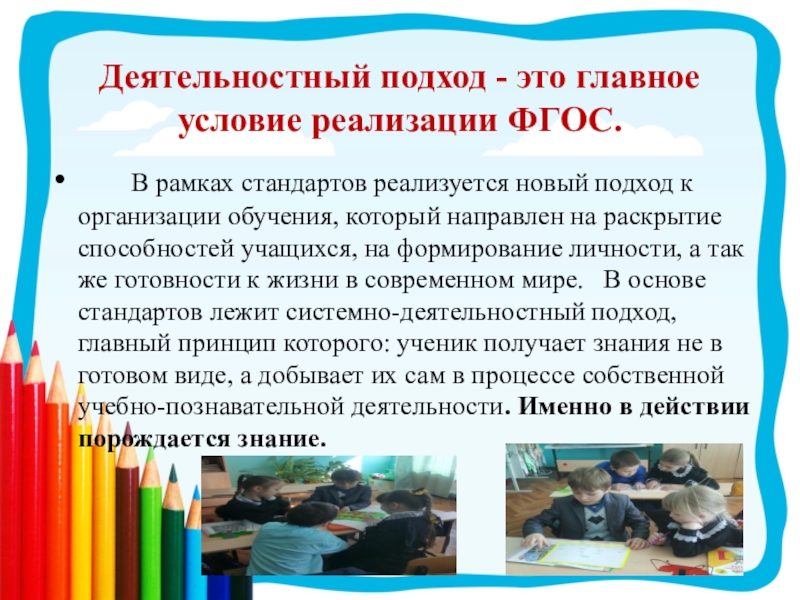 рамках стандартов реализуется новый подход к организации обучения, который направлен на раскрытие способностей учащихся, на формирование личности, а так же готовности к жизни в современном мире. В основе стандартов лежит системно-деятельностный подход, главный принцип которого: ученик получает знания не в готовом виде, а добывает их сам в процессе собственной учебно-познавательной деятельности. Именно в действии порождается знание.