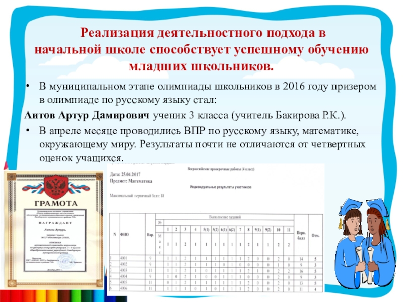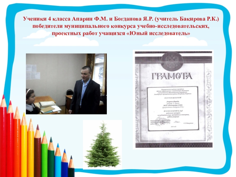 Слайд 11Ученики 4 класса Апарин Ф.М. и Богданова Я.Р. (учитель Бакирова Р.К.)