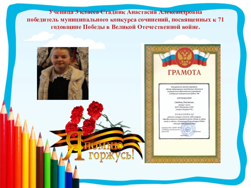 Слайд 15Ученица 3 класса Стадник Анастасия Александровна
