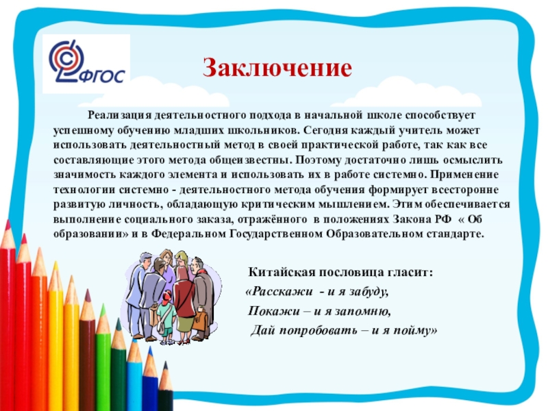 Слайд 14 Реализация деятельностного подхода в начальной школе способствует успешному обучению младших школьников.