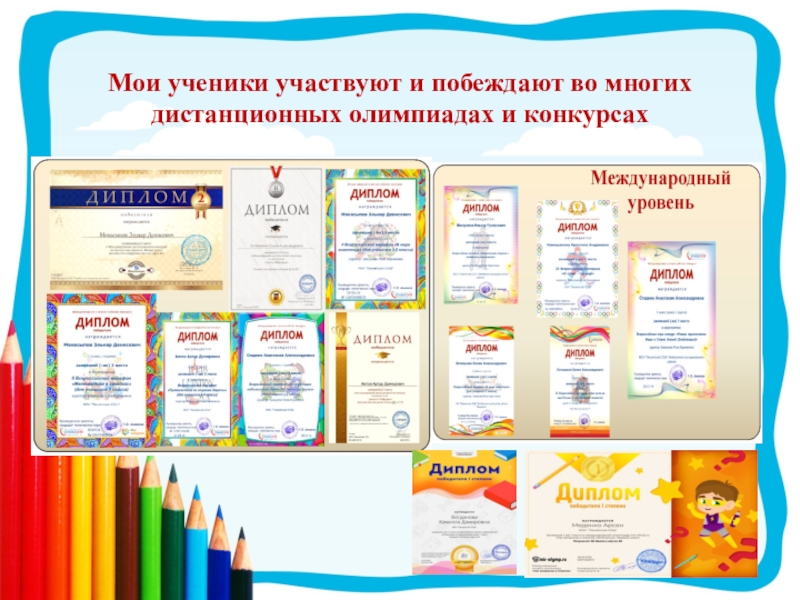 Слайд 16Мои ученики участвуют и побеждают во многих дистанционных олимпиадах и конкурсах
