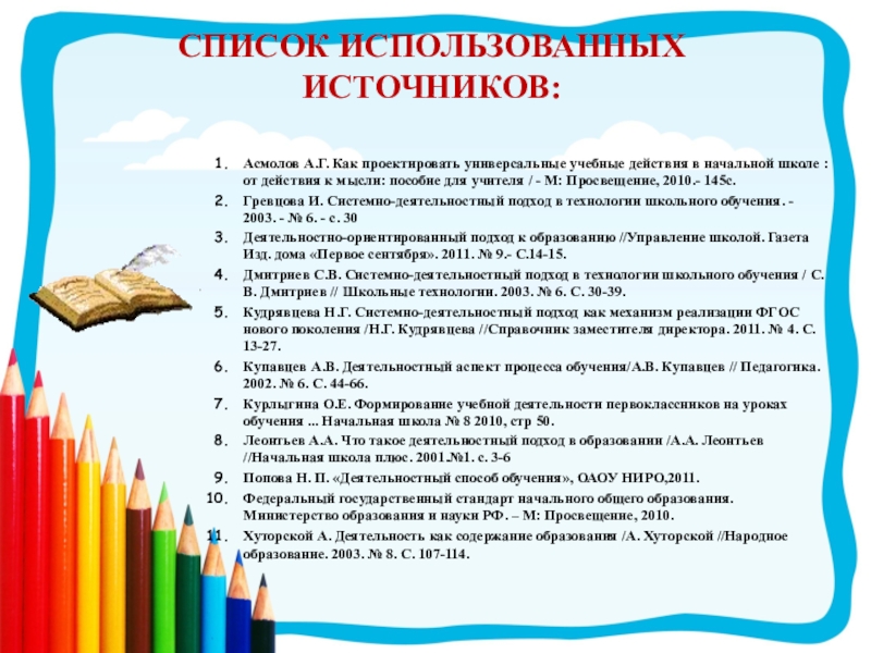 Леонтьев А.А. Что такое деятельностный подход в образовании /А.А. Леонтьев //Начальная школа плюс. 2001.№1. с. 3-6