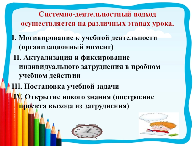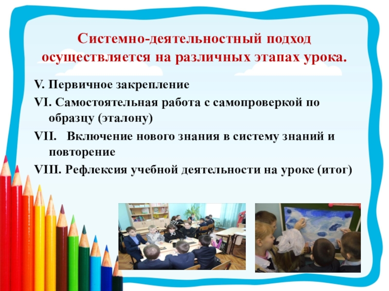 Слайд 8Системно-деятельностный подход осуществляется на различных этапах урока.