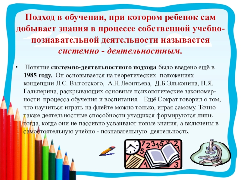 Понятие системно-деятельностного подхода было введено ещё в 1985 году. Он основывается на теоретических положениях концепции Л.С. Выготского, А.Н.Леонтьева, Д.Б.Эльконина, П.Я. Гальперина, раскрывающих основные психологические закономер-ности процесса обучения и воспитания. Ещё Сократ говорил о том, что научиться играть на флейте можно только, играя самому. Точно также деятельностные способности учащихся формируются лишь тогда, когда они не пассивно усваивают новые знания, а включены в самостоятельную учебно - познавательную деятельность.