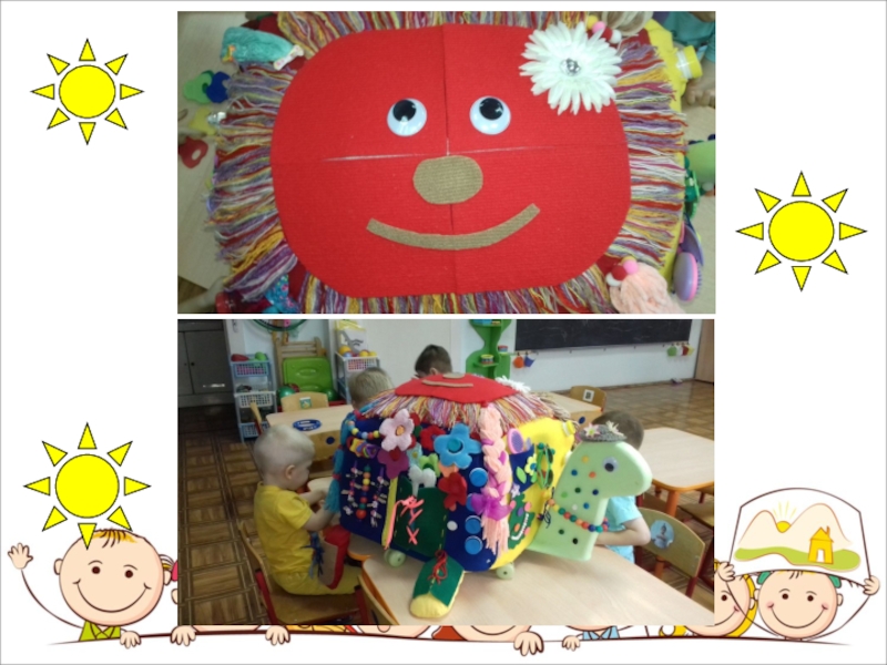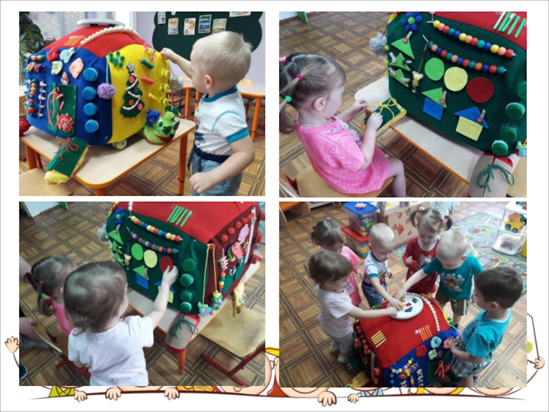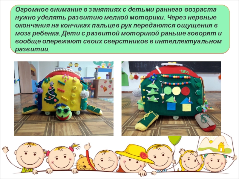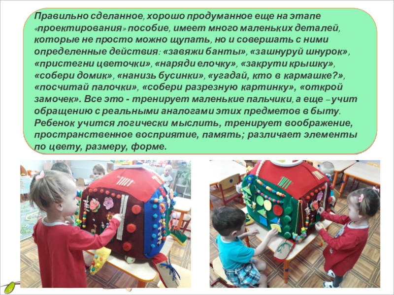 маленьких деталей, которые не просто можно щупать, но и совершать с ними определенные действия: «завяжи банты», «зашнуруй шнурок», «пристегни цветочки», «наряди елочку», «закрути крышку», «собери домик», «нанизь бусинки», «угадай, кто в кармашке?», «посчитай палочки», «собери разрезную картинку», «открой замочек». Все это - тренирует маленькие пальчики, а еще – учит обращению с реальными аналогами этих предметов в быту. Ребенок учится логически мыслить, тренирует воображение, пространственное восприятие, память; различает элементы по цвету, размеру, форме.