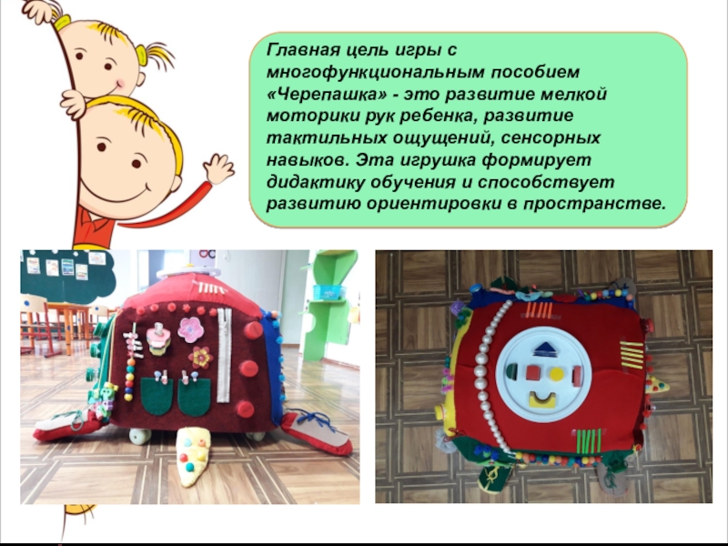интересное пособие для детей! Оно надолго привлекают внимание ребёнка. Игры с многофункциональным пособием «Черепашка» являются хорошим средством релаксации. Ребёнок с удовольствием может долго и спокойно играть самостоятельно. Малыш в первую очередь, учится нажимать, открывать, крутить различные предметы, ребенок не только знакомится с бытовыми вещами, которые есть у него дома, но и развивает определённые навыки: