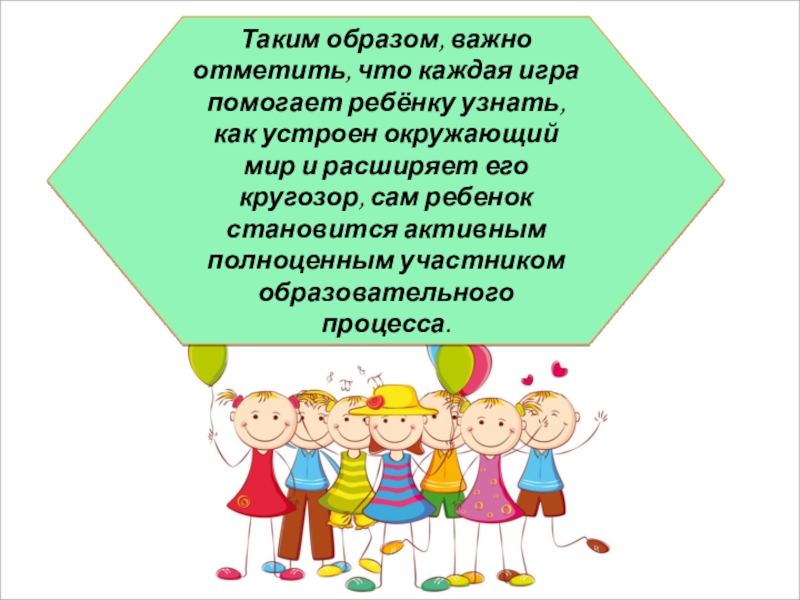 Слайд 9Таким образом, важно отметить, что каждая игра помогает ребёнку узнать, как