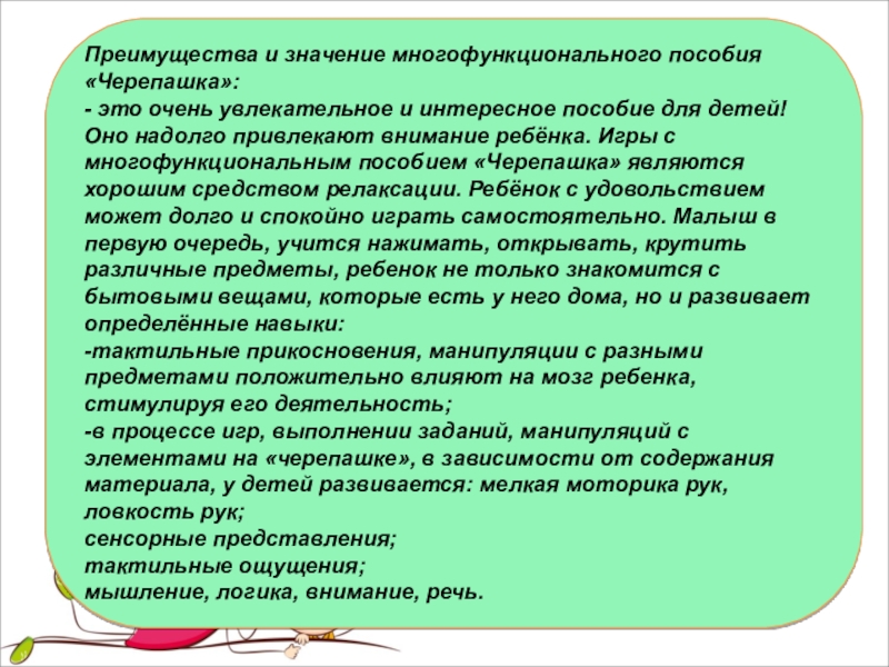 Слайд 7Преимущества и значение многофункционального пособия «Черепашка»: