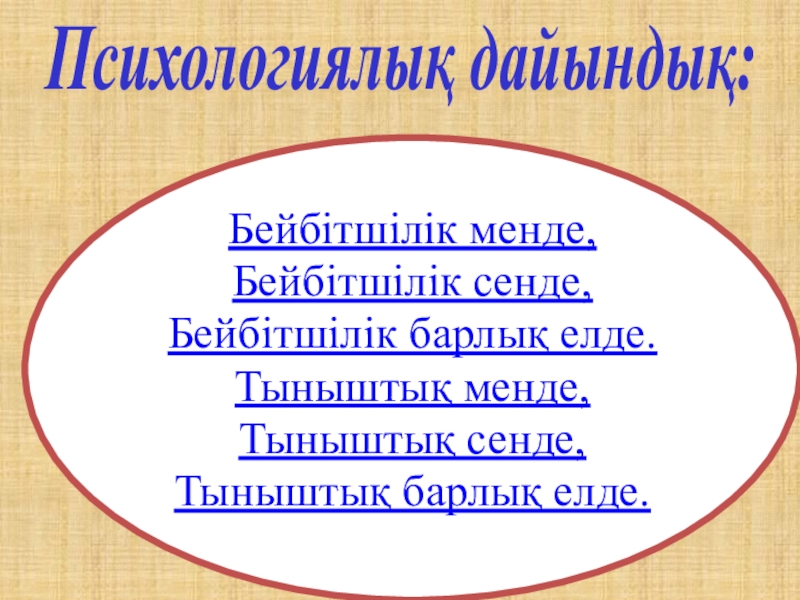 Бейбітшілік менде,Бейбітшілік сенде,Бейбітшілік барлық елде.Тыныштық менде,Тыныштық сенде,Тыныштық барлық елде.Психологиялық дайындық:
