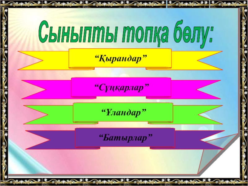 Сыныпты топқа бөлу:“Қырандар”“Сұңқарлар”“Ұландар”“Батырлар”