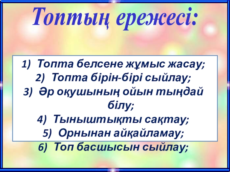 Топтың ережесі:Топта белсене жұмыс жасау;Топта бірін-бірі сыйлау;Әр оқушының ойын тыңдай білу;Тыныштықты сақтау;Орнынан айқайламау;Топ басшысын сыйлау;