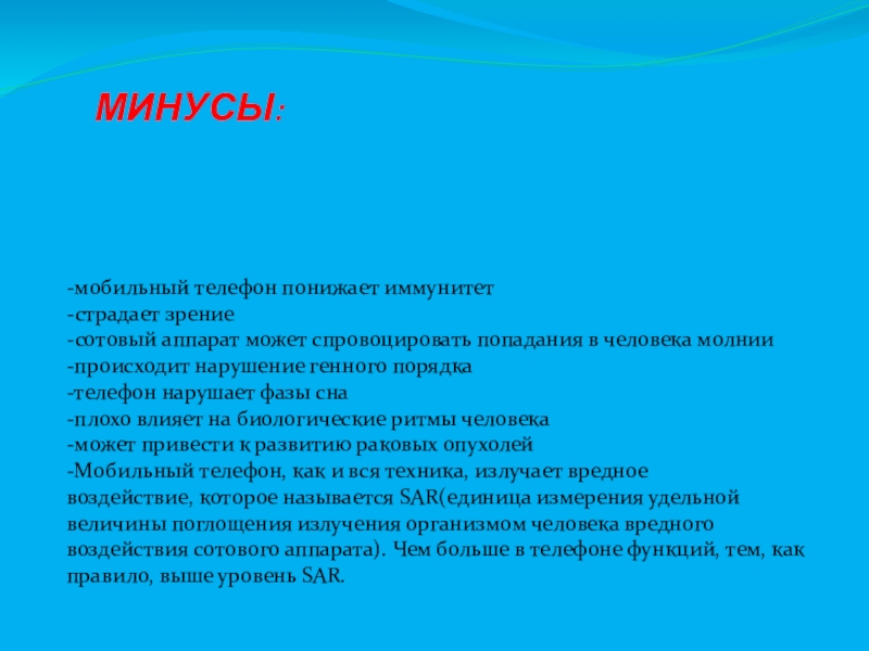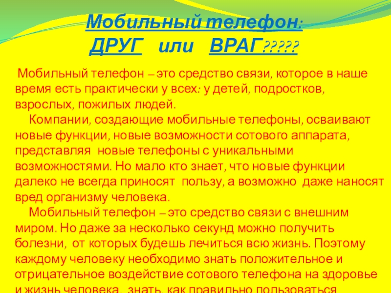 Мобильный телефон – это средство связи с внешним миром. Но даже за несколько секунд можно получить болезни, от которых будешь лечиться всю жизнь. Поэтому каждому человеку необходимо знать положительное и отрицательное воздействие сотового телефона на здоровье и жизнь человека, знать, как правильно пользоваться телефоном и в каких временных рамках.