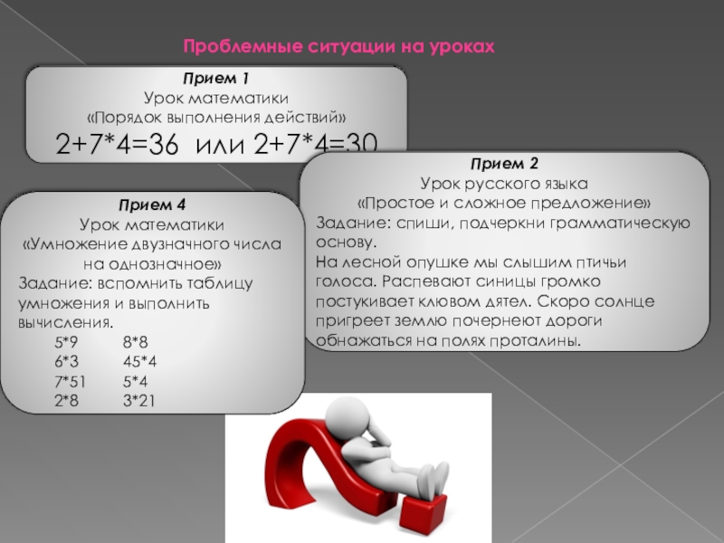 Прием 1. Одновременно предъявить противоречивые факты, теории или точки зрения. Прием 2. Столкнуть разные мнения учеников с помощью вопроса или практического задания