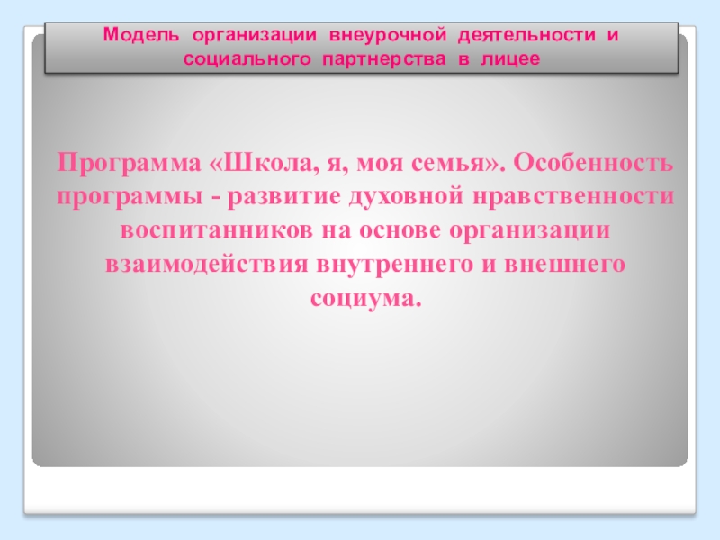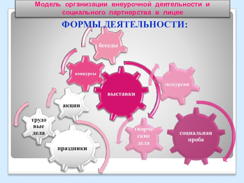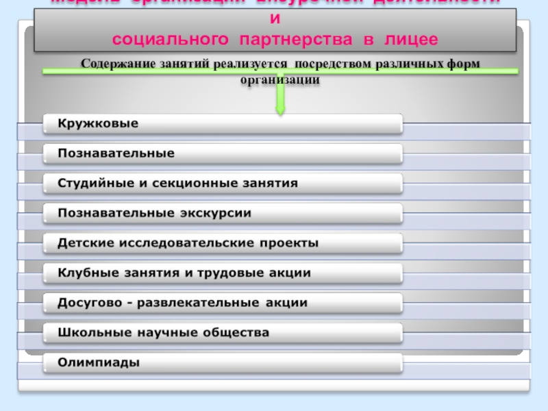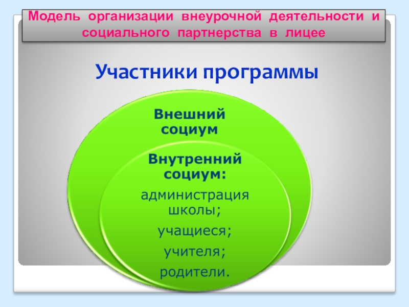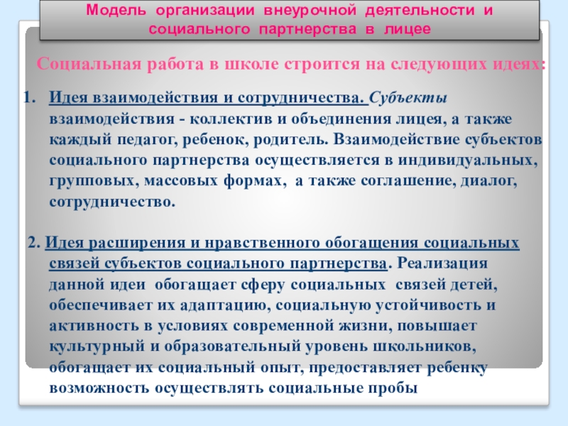 Идея взаимодействия и сотрудничества. Субъекты взаимодействия - коллектив и объединения лицея, а также каждый педагог, ребенок, родитель. Взаимодействие субъектов социального партнерства осуществляется в индивидуальных, групповых, массовых формах, а также соглашение, диалог, сотрудничество.