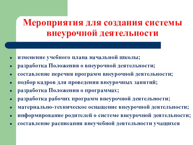 Слайд 3Мероприятия для создания системы внеурочной деятельности