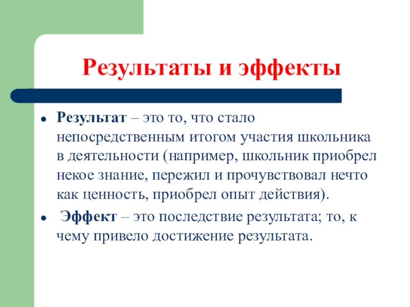 Эффект – это последствие результата; то, к чему привело достижение результата.