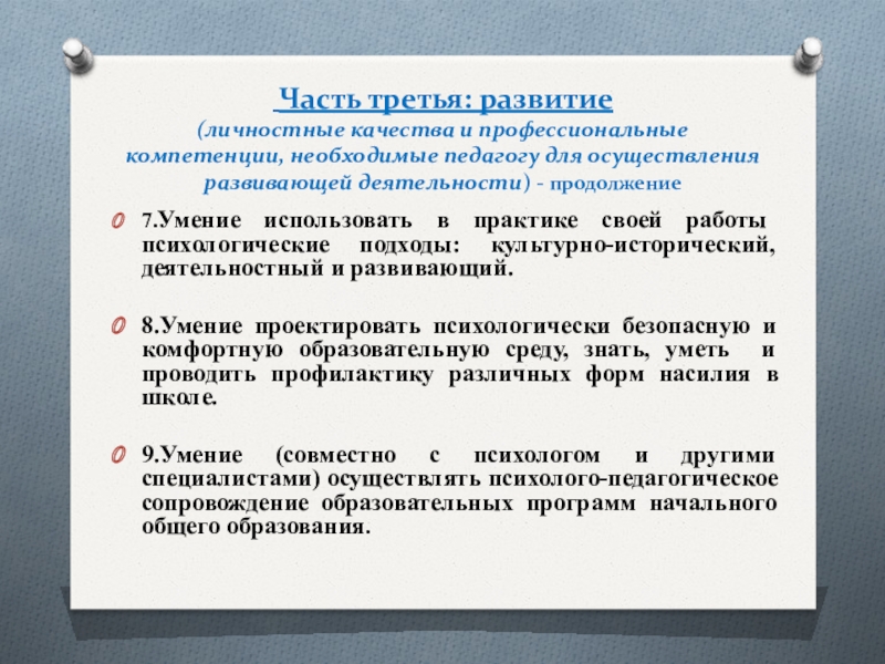 7.Умение использовать в практике своей работы психологические подходы: культурно-исторический, деятельностный и развивающий.
