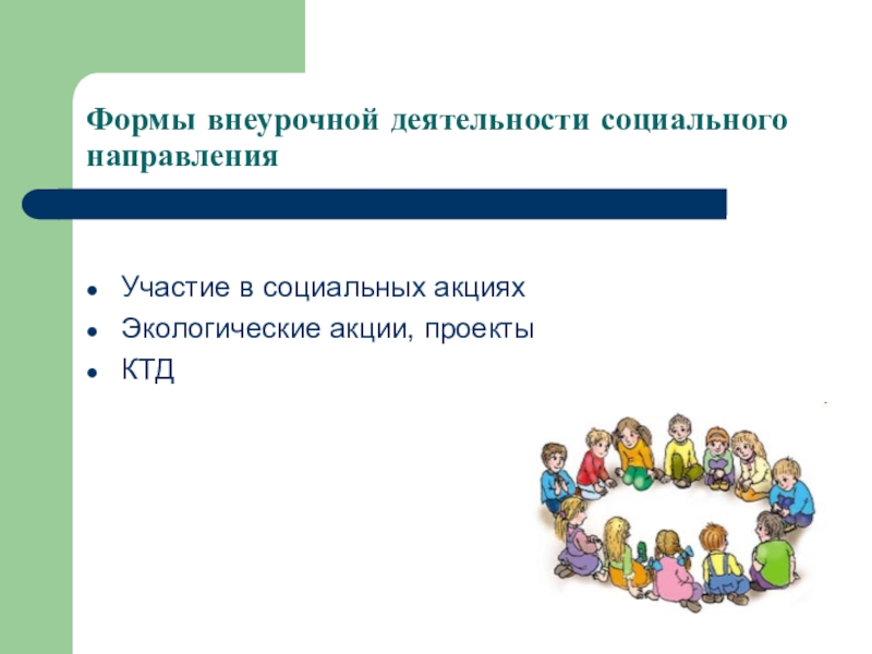 Формы внеурочной деятельности социального направленияУчастие в социальных акцияхЭкологические акции, проектыКТД