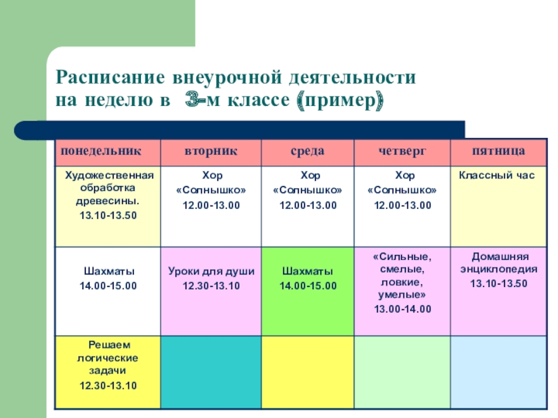 Слайд 10Расписание внеурочной деятельности на неделю в 3-м классе (пример)
