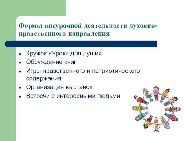 Формы внеурочной деятельности духовно-нравственного направленияКружок «Уроки для души»Обсуждение книгИгры нравственного и патриотического содержанияОрганизация выставокВстречи с интересными людьми