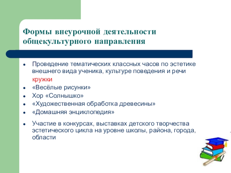 Формы внеурочной деятельности общекультурного направленияПроведение тематических классных часов по эстетике внешнего вида ученика, культуре поведения и
